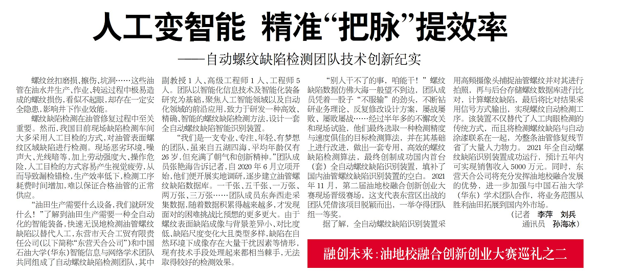 奮進新征程 建功新時代|人工變智能 精準“把脈”提效率——自動螺紋缺陷檢測團隊技術創新紀實 (東營日報專訪)