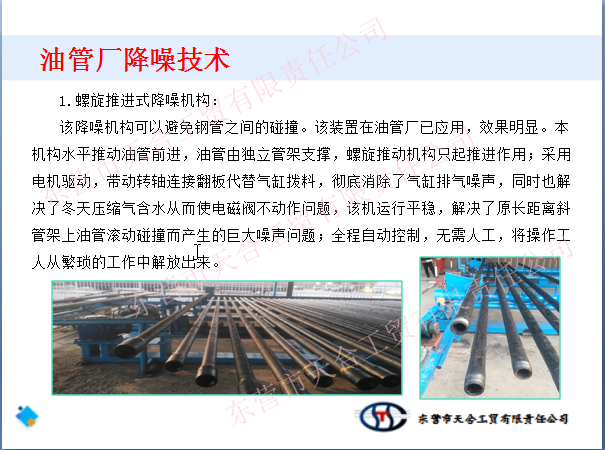 我公司從事油管廠整體噪聲治理多年,對油管廠的噪聲有詳細的了解和解決各類噪聲的完整方案,并且現場經驗十分豐富,針對不同的要求設計出適合客戶的解決方案。從聲源上根治噪聲,經治理后的設備的噪聲從原有110分貝降至65分貝以下,有力的改善職工的工作環境和降低周圍的噪聲污染。
